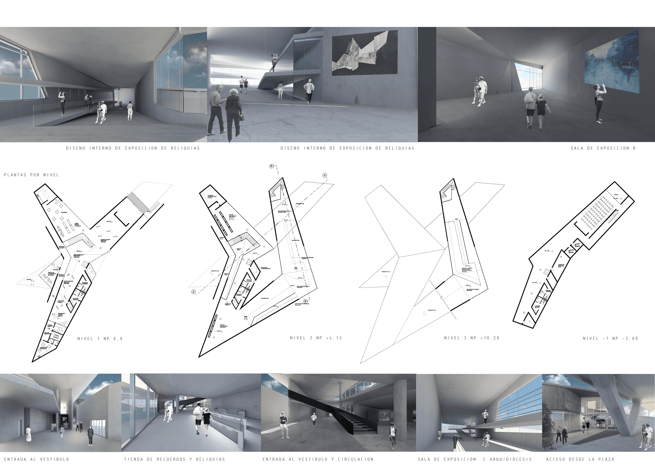 Sacred yet profane. The project it was intended to attract all types of people, by means of different forms of art, not merely religious, where the building begins with contemporary exhibitions representing the most ‘‘mundane’’ only to to climb the most sacred or religious exhibitions. This route represents the accent to God. By means of materials such as the exposed concrete and the inputs of light, they become merely perceptual spaces, where art and religion converge and it is an intimate experience for anyone visiting the museum.